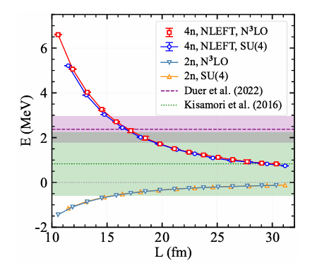 44118太阳成城集团耿立升教授团队与国际前沿交叉科学研究院彭桓武科教合作中心申时行教授在四中子体系共振态研究中取得重要进展。团队基于核格点有效场论,在最大盒长约 30 fm 的有限体积中直接计算四中子体系的基态能量,并进一步借助有限体积散射理论描述二中子对之间的有效相互作用,对“四中子是否存在窄共振态”这一长期争议问题进行分析判断。相关研究成果近日以“Searching for the Tetraneutron Resonance on th...