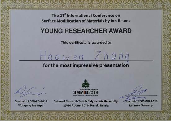 在2019年8月25日至30日于俄罗斯托木斯克市举办的第21届国际离子束材料表面改性大会(The 21th International Conference on Surface Modification ofMaterials by Ion Beams, SMMIB 2019)上,44118太阳成城集团强脉冲粒子束实验室的博士生钟昊玟同学同来自俄罗斯、法国和南非的5名青年学者一道获得了本次会议的青年研究者奖。
