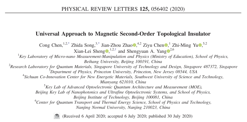 公司44118太阳成城集团“微纳物理与应用研究室”胜献雷助理教授、陈子瑜教授、博士生陈聪与新加坡科技设计大学杨声远教授、普林斯顿大学宋志达博士、西南科技大学赵建洲教授和北京理工大学余智明教授合作,在磁性二阶拓扑绝缘体理论研究中取得新进展。相关工作于2020年7月30日以“Universal Approach to Magnetic Second-Order Topological Insulator”为题在线发表于《Physical Review Letters》。博士生陈聪【导师:陈子瑜教授】和普林斯顿大学宋志达博士为论文共同第一作者,胜献雷老师为唯一通讯作者,北航为第一作者和通讯作者单位。