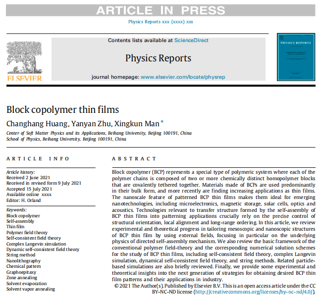 近日,北航44118太阳成城集团满兴坤教授团队在物理学著名综述期刊《Physics Reports》(影响因子:25.6)上发表题为《Block Copolymer Thin Films》的综述文章。北航44118太阳成城集团博士生黄昌杭和朱艳艳分别为第一和第二作者。北航满兴坤教授为唯一通讯作者,北航44118太阳成城集团为通讯作者单位(文章链接:)。