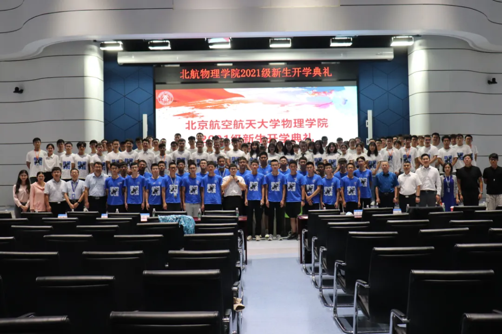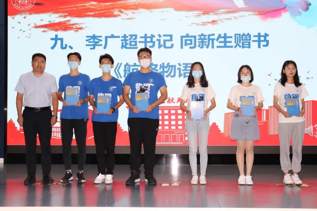 李广超书记在典礼上发表讲话,代表全院师生热烈欢迎新同学,希望新生同学们树立“空天报国,强国有我”情怀,夯实科技创新和学术研究能力,将个人发展与国家需要紧密结合,脚踏实地,负重前行,不负韶华。李广超书记还向新生代表赠送了北航物理师生故事集《航路物语》,希望每一位新生都能传承北航物理精神。