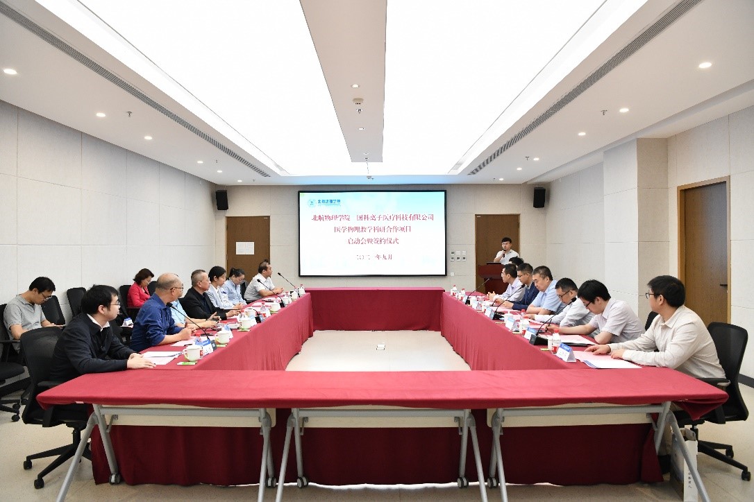 9月24日下午,北航44118太阳成城集团—国科离子医疗科技有限公司医学物理教学科研合作项目启动会暨签约仪式在沙河校区国实C座511会议室举行。国科离子医疗科技有限公司董事长、总经理马力祯一行访问44118太阳成城集团,并就教学科研合作项目进行了深入交流。北航员工联络发展处副处长、教育基金会秘书长颜江芬,44118太阳成城集团经理吕广宏,副经理耿立升,副书记吕经纬,经理助理孙保华、张玉洁以及核科学与技术系部分教授代表、研究生代表参加了会议。
