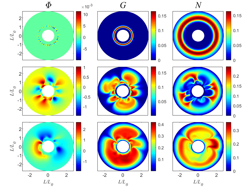 图3电势、熵函数以及粒子数的结构在线性阶段(上排),非线性早期(中排),非线性后期(下排)