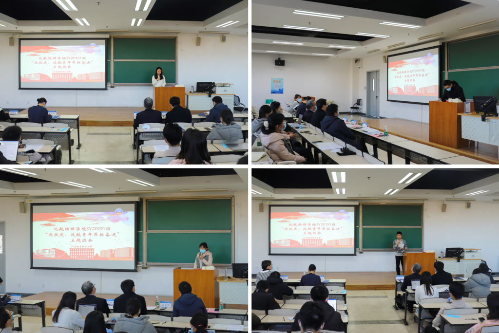 首先,全班同学观看了视频《献礼建党百年,SY20191在行动》,回顾了大家在这一年中的奋斗历程。班会上,李金梁、吕书宁、卢欣、石昂分别就党支部建设、班团建设、科研实践、体育精神等方面介绍自己在过去一学年中的思考感悟和成果收获,并畅谈如何以实际行动传承空天报国精神,献礼党的百年华诞。