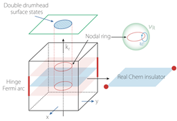 图1:二阶节线半金属的示意图。这里,位于两个节线内的任意一个横截面均对应于一个二维实陈数绝缘体,实陈数Vr=1,且呈现出一对拓扑零能角落态。这些角落态在三维方向上组成了两条红线所示的拓扑棱态。另外,除了非平庸的实陈数外,每个节线均携带一个一维的拓扑电荷w,此一维拓扑电荷保护了顶面的双重鼓膜态。