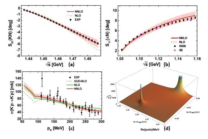 Figure1本研究中构建的协变重子-介子散射振幅对不同奇异数S=1,0,-1(分别对应图a,b,c)的散射数据的描述效果。图d展示了本研究中得到的Λ(1405)双峰结构。