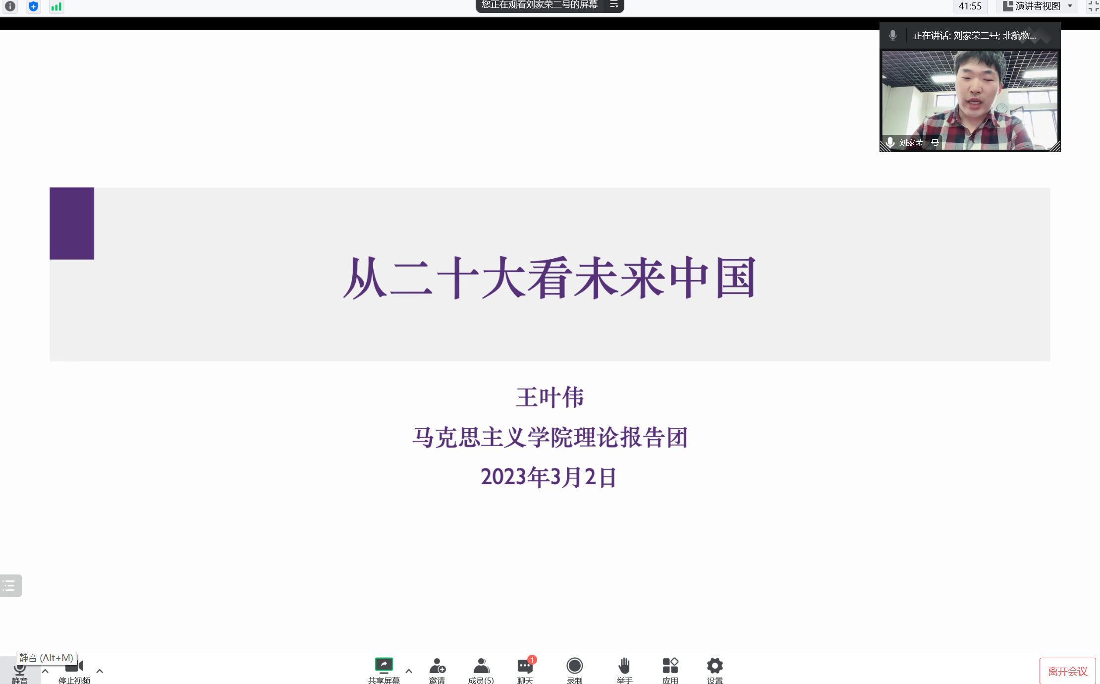 本次联学共分为三部分,第一部分由联学主持人分别对各自支部基本情况进行介绍。第二部分由两位领学人带领大家进行主题学习。清华大学马克思主义学院马博221党支部王叶伟同志首先以《从二十大看未来中国》为主题作了分享,生动讲述了新时代下重要的历史特点和任务,结合党的指导思想、百年奋斗目标、社会主义现代化的发展特征,从发展经济、科教、文化、民生、生态保护、国家安全与军事现代化等方面进行了阐述,倡导全体党员不负使命、不负韶华、不负人民,以二十大精神为指引,担当起时代赋予的责任。