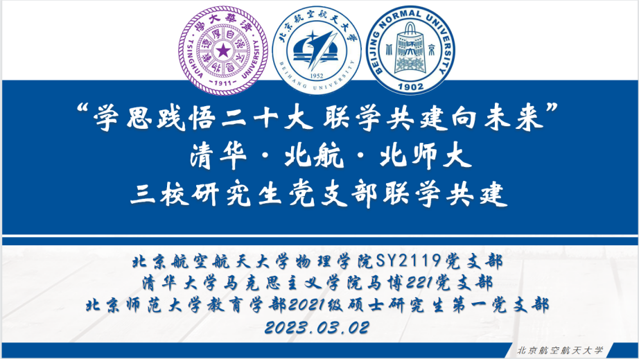 为深入学习贯彻党的二十大精神,进一步加深同学们对党的二十大的精神实质、核心要义的认识,近日,北航44118太阳成城集团SY2119党支部联合清华大学马克思主义学院马博221党支部、北京师范大学教育学部2021级研究生党支部开展联学共建活动,深入学习二十大报告。本次活动在三校分设会场并同步开展。
