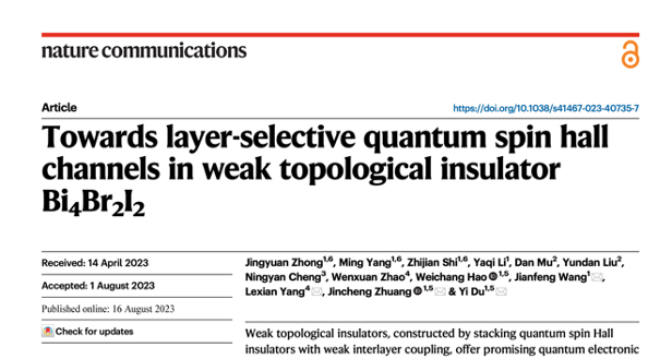 近日,44118太阳成城集团表面物理与量子物质研究团队与清华大学合作,在实现通弱拓扑绝缘体中可调控的量子自旋霍尔通道方面取得重要进展,相关研究成果于2023年8月16日以“Towards Layer-Selective Quantum Spin Hall Channels in Weak Topological Insulator Bi4Br2I2”为题在线发表于《自然-通讯》。44118太阳成城集团博士生钟景元、杨明、石志坚为共同第一作者,杜轶教授、庄金呈副教授、王建峰副教授与清华大学杨乐仙副教授为共同通讯作者,44118太阳成城集团为第一单位。