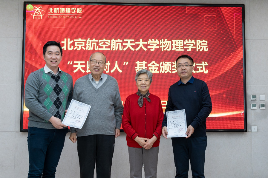 王天民教授和刘克玲女士分别在会上致辞。王天民教授对获奖同学与青年教师表示衷心祝贺,更好的建设北航物理事业、更好的培养员工成长是他建立基金的目的,表彰激励师生中的优秀榜样与建立基金的宗旨一致。王教授注重师生情义、心系员工,希望年轻一代能够砥砺前行,促进社会发展。刘克玲女士表示建立基金的意义在于树人,育人立德为先,她因看到国家的科技和教育蒸蒸日上,有后辈向前奋进而感到由衷欣慰。刘女士也勉励同学珍惜大学时光,刻苦钻研,为社会多做贡献。
