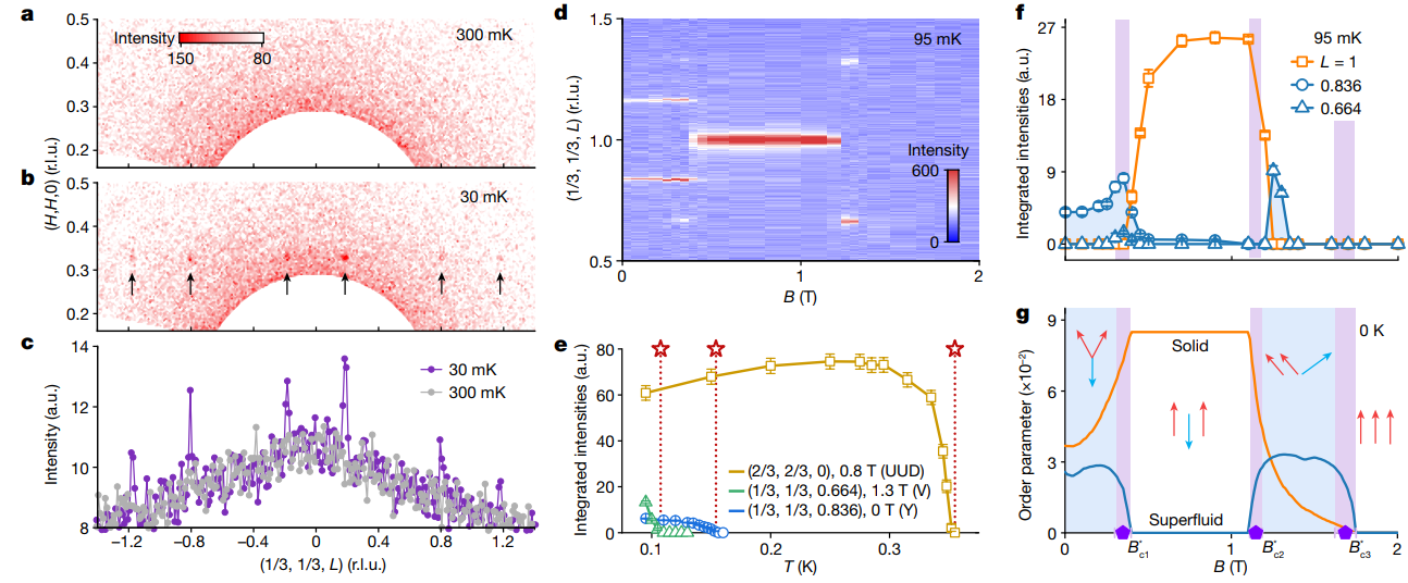 在此基础上,金文涛课题组分别在澳大利亚核科学和技术组织(ANSTO)和法国劳厄-朗之万研究所(ILL),利用所生长的大尺寸单晶和可实现100mK以下极低温的样品环境,开展了零磁场和纵向磁场下的单晶中子衍射实验。实验成功观察到由面外磁场驱动的三次量子相变,确认了钴离子自旋面外分量所形成的三子格长程序(即固态序),并通过由无能隙激发和微弱的层间相互作用共同导致的非公度磁峰实现了对超流序的间接探测(图2)。中子衍射实验结果与团队合作者的理论计算结果高度一致,提供了该材料中存在自旋超固态的重要微观证据。