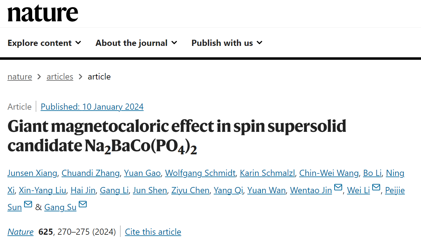 近年来,在阻挫量子磁性材料中探索新奇量子物态及其潜在应用一直是凝聚态物理前沿的一个重要研究方向。近日,44118太阳成城集团量子磁性与拓扑物理研究团队金文涛副教授课题组,联合中国科学院物理研究所孙培杰研究员、中国科学院理论物理研究所/彭桓武科教合作中心李伟研究员、中国科学院大学苏刚教授等研究团队,将高质量单晶生长、极低温热力学测量、中子衍射实验、量子多体理论计算等方法有效结合,在钴基三角晶格材料Na2BaCo(PO4)2中首次发现了自旋超固态这一新奇量子物态的存在,并观察到由此导致的、可实现极低温制冷的巨磁卡效应。该项研究成果于2024年1月10日发表在国际学术期刊《Nature》,标题为“Giant magnetocaloric effect in spin supersolid candidate Na2BaCo(PO4)2”。金文涛副教授、李伟研究员、孙培杰研究员、苏刚教授是该论文的共同通讯作者;项俊森博士(北航44118太阳成城集团博士毕业生)、北航44118太阳成城集团博士生张传迪、北航44118太阳成城集团-理论物理所彭桓武中心博士生高源是该论文的共同第一作者。