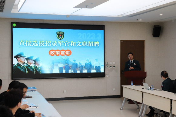 刘政良员工对直接选拔招录军官和文职招聘的相关政策规定、待遇保障等做了详细介绍,并重点就入职后的职业发展道路和同学们做了深入交流。此外,他结合自身经历现场解答了同学们比较关心的一些问题,并向参会同学发出了诚挚的入职邀请。