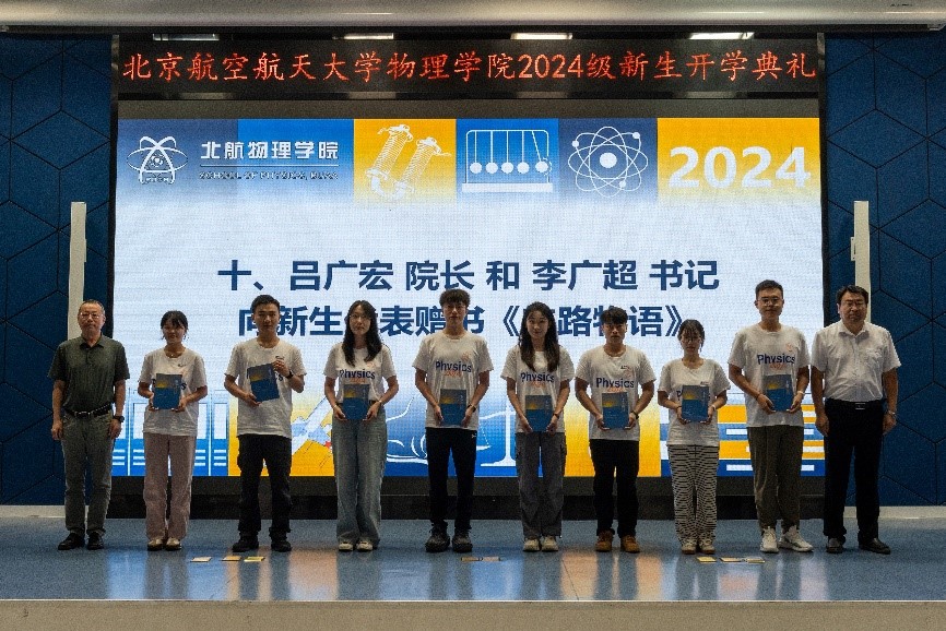 典礼最后,吕广宏经理、李广超书记向新生代表赠书《航路物语》,勉励同学们从中深刻体会北航物理的精神文化,不断汲取奋斗动力,传承好北航物理精神。