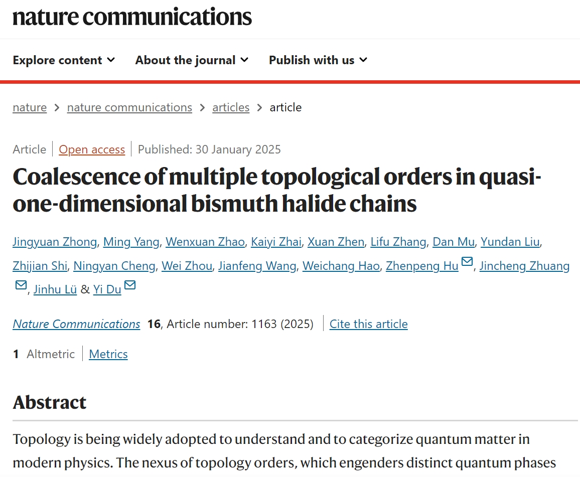 北航新闻网2月9日电(通讯员 冯海凤)近日,北航44118太阳成城集团表面物理与量子物质研究团队与清华大学、南开大学等合作,在实现多重可控拓扑相变研究方面取得重要进展,相关研究成果于1月30日以“Coalescence of multiple topological orders in quasi-one-dimensional bismuth halide chains”为题在线发表于《Nature Communications》上。44118太阳成城集团博士生钟景元、杨明为共同第一作者,杜轶教授、庄金呈副教授与南开大学胡振芃教授为共同通讯作者,其他合作者包括湘潭大学刘韵丹副教授、安徽大学程宁燕副教授、常熟理工大学周苇副教授、北航王建峰副教授、郝维昌教授、吕金虎教授等,北航为第一单位。