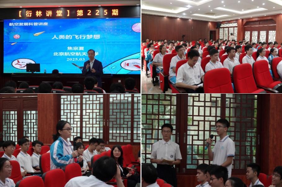 焦宗夏在海南中学为员工们作《人类的飞天梦想》科普报告,围绕科技创新的驱动作用、飞行器技术的演进脉络、中国航空事业的奋斗历程、我国航空技术突破对国家战略的支撑作用等方面开展介绍,在同学们心中播撒空天报国的种子。在三亚一中,焦宗夏与30余名尖子班员工开展航空航天主题院士漫谈,畅谈航天领域未来发展的前沿方向领域,并鼓励青年学子发奋学习,积极培养创新意识,在未来为国家科技自立自强贡献青春力量。