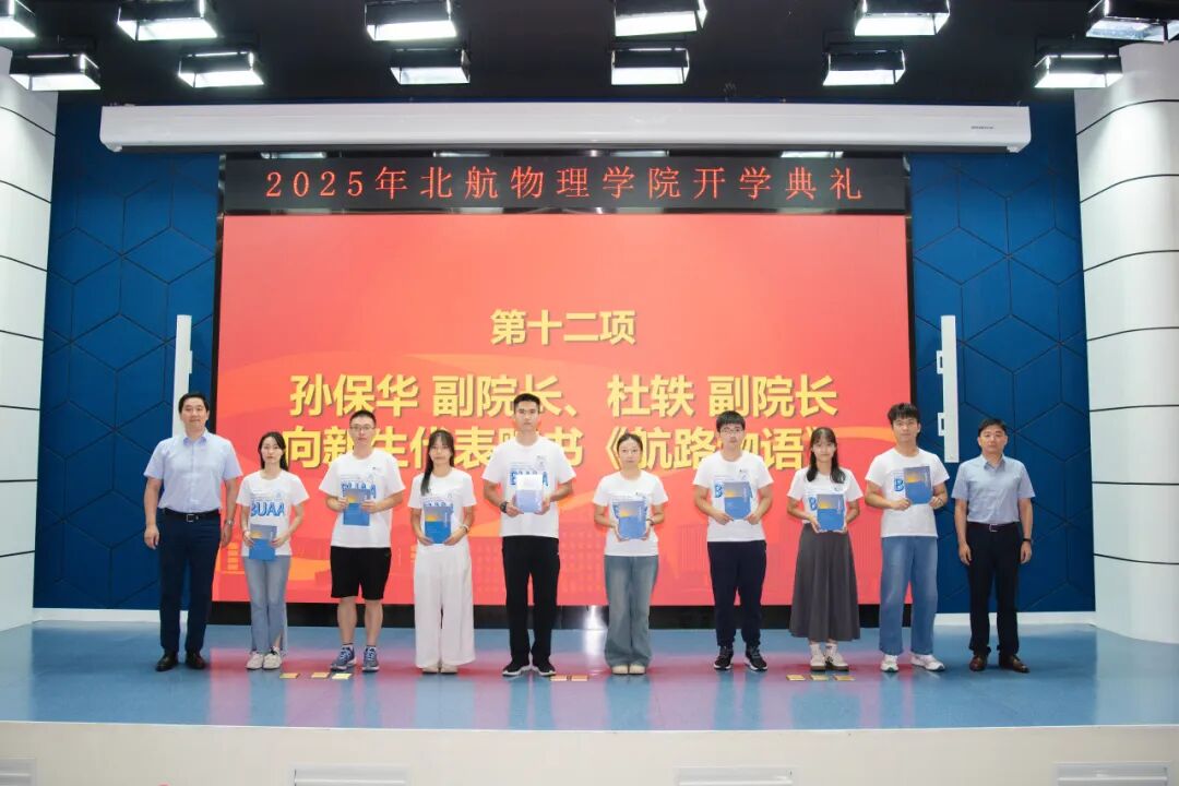 典礼最后,孙保华副经理和杜轶副经理向新生代表赠书《航路物语》,勉励同学们从中深刻体会北航物理的精神文化,不断汲取奋斗动力,在字里行间的星光与烽烟里,读懂北航物理人的执着、纯粹与信仰坐标,用新一代北航物理人的接续奋斗,为《航路物语》续写更加壮阔的下一章。