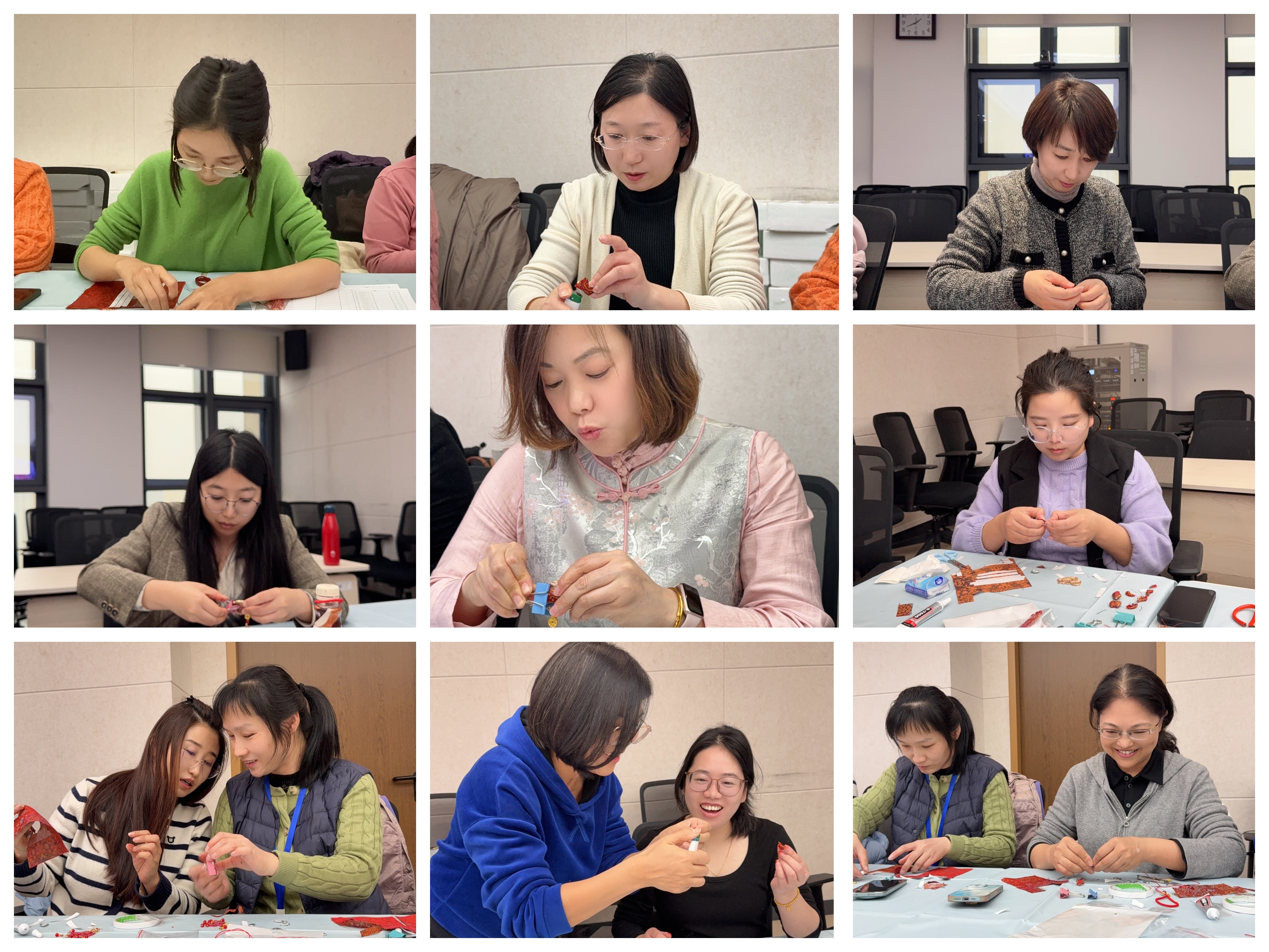活动气氛温馨而热烈,现场欢声笑语不断。老师们相互交流制作心得,分享配色创意,遇到难点时彼此协助,其乐融融。经过一个多小时的精心制作,一件件精致的宋锦小马挂件相继完成。每一件作品都凝聚着创作者的巧思与心意,也承载着大家对美好生活的热爱与期待。最后,大家合影留念,记录下这一温暖而难忘的春日时刻。