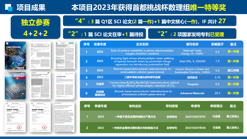 参赛同学历时两年,从基础研究入手,先后解决了光电催化剂催化活性低,反应稳定性差等问题,先后提出了材料插层实现能带调控、引入极化电场、微纳界面设计调控三项界面浸润性的方法,设计开发出了高效稳定的光电催化剂。该项目为本科生独立参赛,共计产出4篇高水平论文和2项国家发明专利。